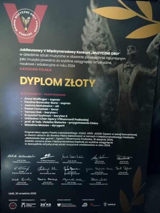 Artists from the Podlasie Opera and Philharmonic received a Golden Diploma during Saturday’s (September 20) Gala of the 5th Anniversary International Musical Eagles Competition. The Competition Jury awarded them in the Premiere category for their opera Joash, King of Judah by Paweł Łukaszewski. The diploma was accepted by the Director of the Podlasie Opera and Philharmonic, Professor Violetta Bielecka. Thank you for this wonderful distinction!