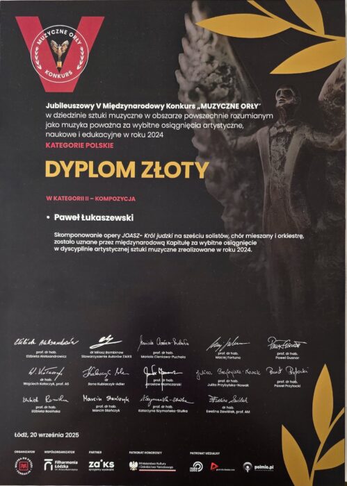 The Golden Diploma for composing the opera Joash, King of Judah (in the Composition category) was also awarded to the composer himself, Professor Paweł Łukaszewski, who has collaborated with the Podlasie Opera and Philharmonic for years, enriching its repertoire with outstanding compositions. This is one of five distinctions awarded to the composer during Saturday’s Musical Eagles Gala. Congratulations!