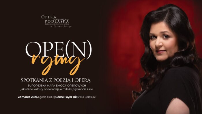 W marcu Opera i Filharmonia Podlaska zaprasza również dorosłych odbiorców na kolejne kameralne spotkanie pod nazwą OPE(N)RYMY – spotkania z poezją i operą. To nowa inicjatywa edukacyjna, której pierwsza odsłona miała miejsce w grudniu i spotkała się z bardzo ciepłym przyjęciem publiczności. OPE(N)RYMY pokazują, jak słowo w arii staje się muzyką, a muzyka – opowieścią. W programie znajdują się arie wykonywane na żywo oraz anegdoty o powstawaniu operowej emocji – od poetyckiego tekstu, przez frazę, po interpretację solisty. To propozycja zarówno dla stałych melomanów, jak i osób, które dopiero rozpoczynają swoją przygodę z operą. Kolejne spotkanie, pod nazwą: Europejska mapa emocji operowych, ukaże, w jaki sposób różne tradycje i kultury wyrażają miłość, tęsknotę oraz wewnętrzną siłę. Zapraszamy 22 marca o godz. 18.00.