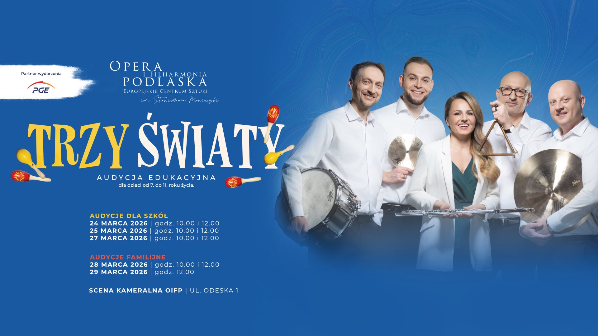 W marcu powróci także audycja Trzy światy, podczas której muzycy Orkiestry Opery i Filharmonii Podlaskiej zabiorą najmłodszych w podróż przez świat muzyki klasycznej, rozrywkowej oraz instrumentów perkusyjnych. Uczestnicy przekonają się, czy można stworzyć muzyczny pejzaż bez tradycyjnych instrumentów perkusyjnych i jak wiele barw kryje w sobie rytm. Dzieci poznają różnorodne instrumenty – od bębnów i werbla po fleksaton i bongosy – a dzięki dźwiękom i wyobraźni przeniosą się na różne kontynenty. Audycje szkolne dla uczniów klas I-IV szkół podstawowych odbędą się 24, 25 i 27 marca, a audycje familijne – 28 i 29 marca.