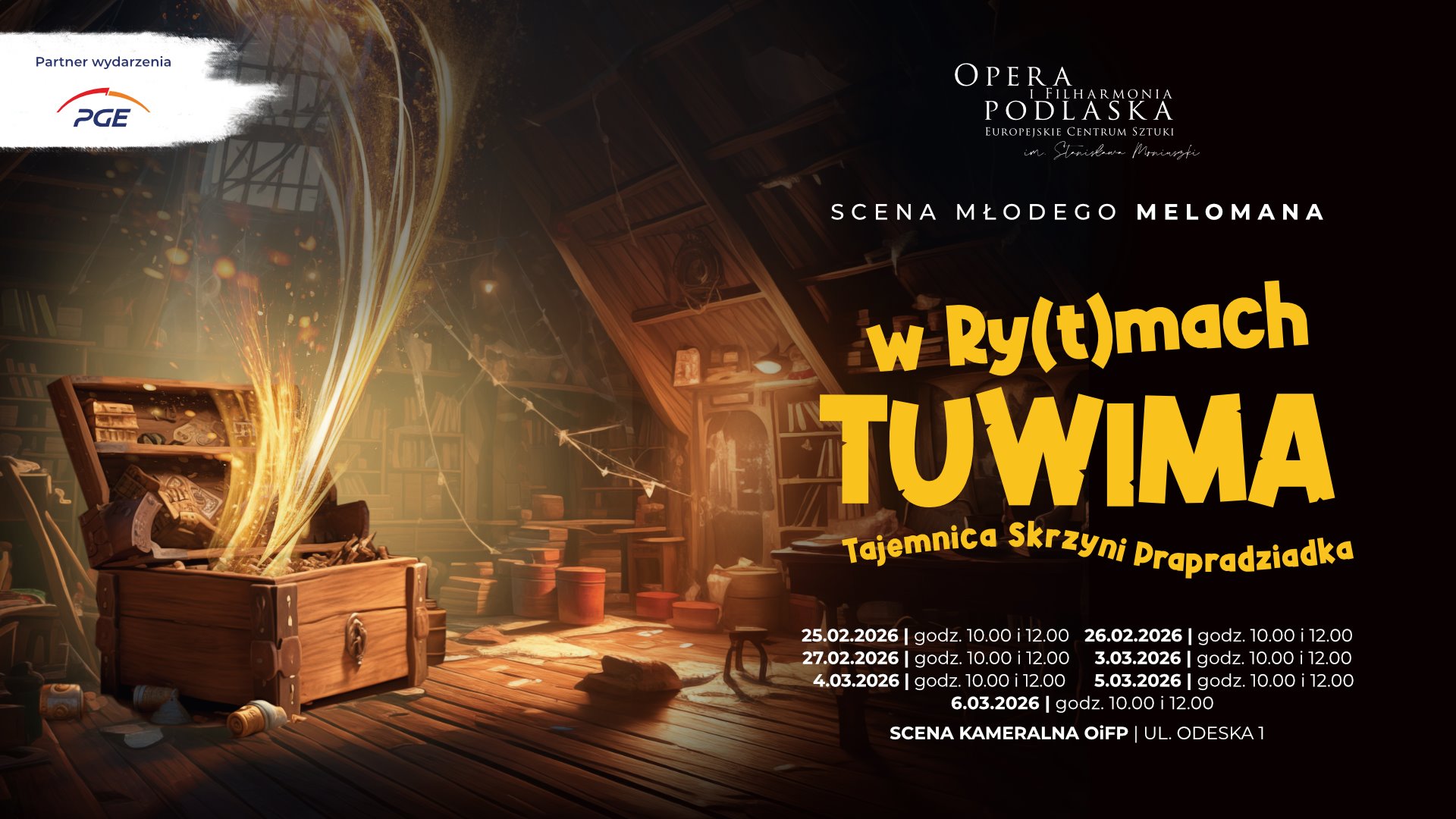 Pierwszą propozycją jest audycja edukacyjna W ry(t)mach Tuwima: tajemnica skrzyni prapradziadka, skierowana do uczniów klas I-IV szkół podstawowych. To poetycka podróż przez słowo, muzykę i rytm inspirowana twórczością Juliana Tuwima. Podczas warsztatów dzieci poznają sylwetkę i dorobek poety, a głównym motywem spotkań będzie rytm – obecny zarówno w wierszu, jak i w muzyce. Zajęcia są połączeniem lekcji literatury i muzyki, rozwijają wrażliwość i uczą świadomego odbioru sztuki. Audycje odbędą się 3, 4, 5 i 6 marca na Scenie Kameralnej OiFP przy ul. Odeskiej 1.