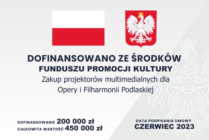 The project involves the purchase of a modern, laser multimedia projector, along with the necessary computer to operate it, and two media servers with an installation kit for the Podlasie Opera and Philharmonic. The equipment purchase will reduce the institution’s operating costs and significantly increase our capabilities in creating virtual scenography and multimedia projections during cultural and artistic events.