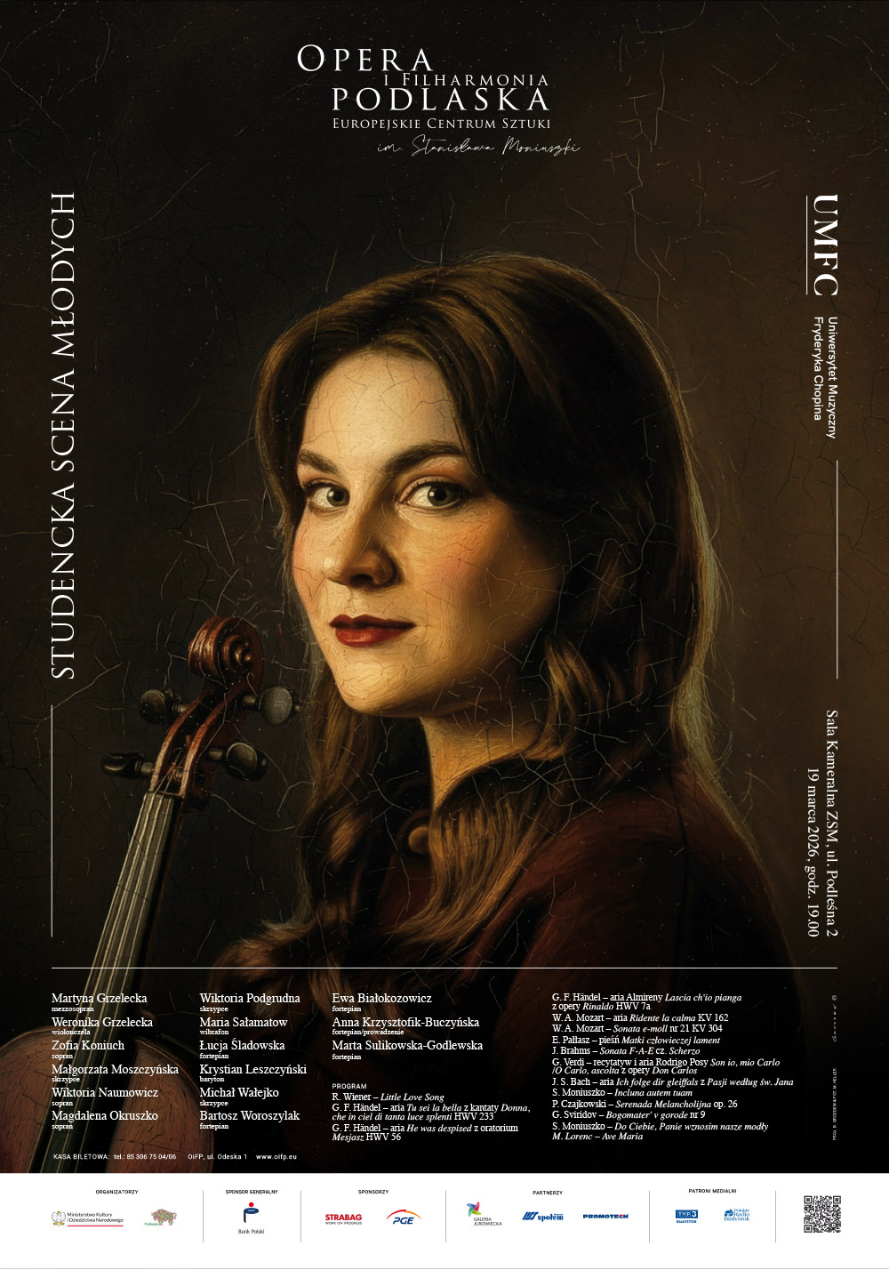 We invite you to concerts from the ‘Academic Youth Stage’ series. This project is part of a collaboration between the Podlasie Opera and Philharmonic and the Fryderyk Chopin University of Music, Białystok Branch, Faculty of Instrumental-Pedagogical Studies, Music Education, and Vocal Studies.