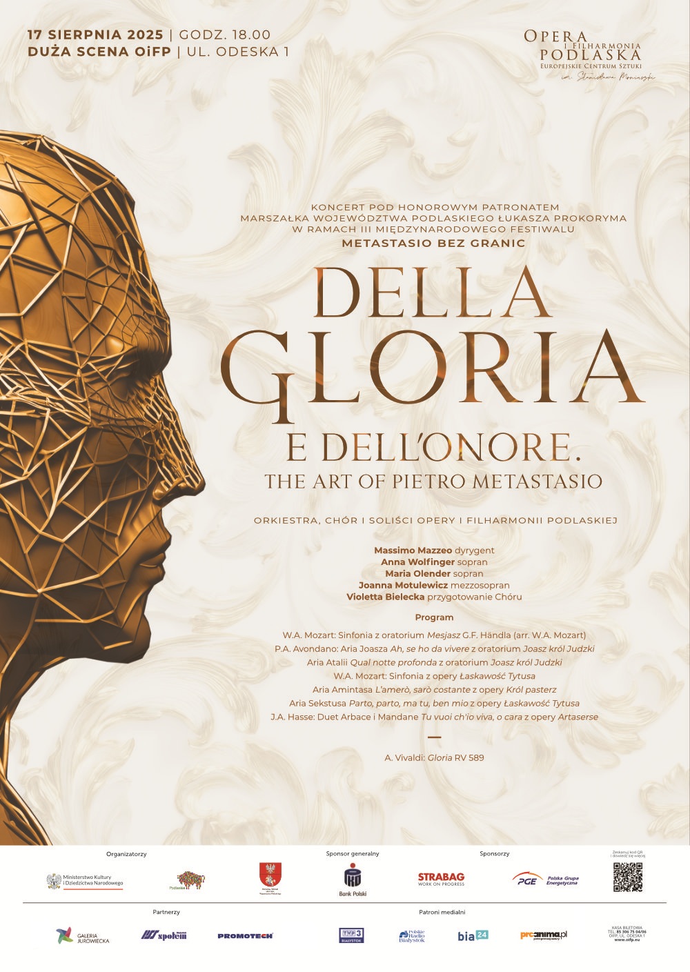 17 sierpnia zapraszamy na wyjątkowy koncert w ramach III Międzynarodowego Festiwalu Metastasio bez granic. Wystąpi przed Państwem Orkiestra i Chór Opery i Filharmonii Podlaskiej oraz wybitni soliści (Anna Wolfinger – sopran, Maria Olender – sopran, Joanna Motulewicz – mezzosopran) pod dyrekcją Maestro Massimo Mazzeo.