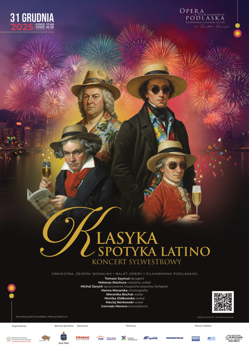 Niezapomniany wieczór sylwestrowy w Operze i Filharmonii Podlaskiej. Zapraszamy na wyjątkowy koncert, który połączy majestat muzyki klasycznej z gorącymi rytmami Ameryki Łacińskiej. Arcydzieła Mistrzów w nowych, fascynujących aranżacjach latino. Carmen G. Bizeta w rytmie salsy, Życzenie F. Chopina w brazylijskiej bossie, kompozycje Mozarta, Moniuszki, Verdiego i Pucciniego w rytmach latynoamerykańskich. Na scenie: orkiestra symfoniczna OiFP pod batutą Tomasza Szymusia, znakomici soliści i chórek wokalny, tancerze w widowiskowych kostiumach, porywająca choreografia oraz spektakularne wizualizacje.