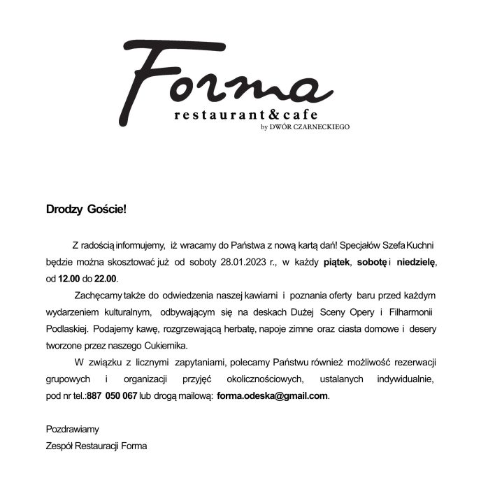 Forma restaurant is a culinary safe harbor in a building belonging to the intitution constituting the very heart of cultural scene in North East Poland. Putting an emphasis on new flavours and highest quality products, Forma is a great place for those who want to rest for a moment in silcence and to delight in refined meals and desserts.